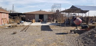 I’m not sure about you but we’ve been thinking on setting up a big out door work space since we bought our house. We need a spot to build Edible Carnival attractions after all, and we’ve found that out here in New Mexico if you have shade you can basically work outdoors year round. We installed a small awning Russell had built at our previous residence but it’s not large enough to accommodate our next projects so we decided it would behoove us to install a much larger covered work area.