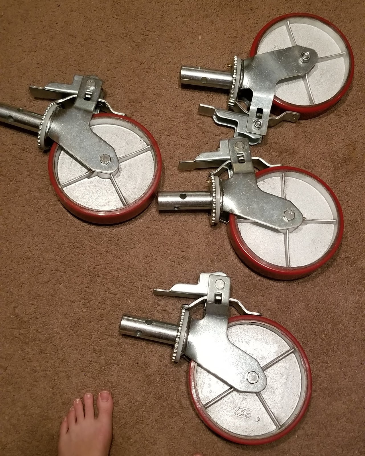 Russell scoured Craigslist and got us a variety of used scaffold parts and we ended up buying some nice big scaffold casters. (We’ll use these for other projects in future so we figured it was worth it to spend the extra money now to reduce the amount of times we have to take apart scaffold)