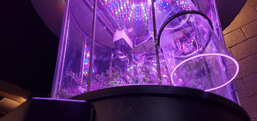 The Space Harvest is an interactive game where anyone can, with a quarter, take a chance at harvesting the plants found within. Space Harvest includes a self watering system, LED arrays in the UFO ring, & a set of grow lights to keep the plants inside happy.