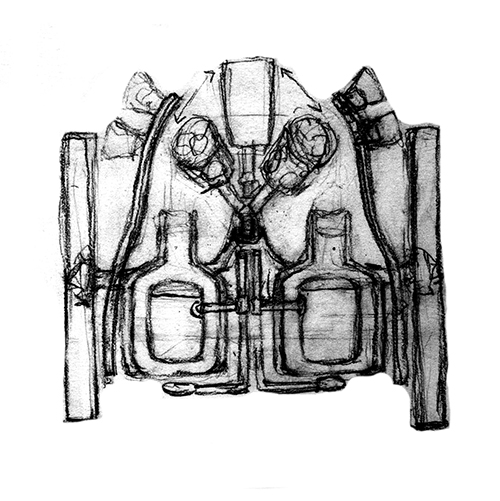 The Rotisserie Chariot is a life-size horse puppet pulling a chariot of fire. The chariot is equipped with a rocket stove and pyrolization chamber. As the stove burns, the internal chamber turns wood into charcoal.