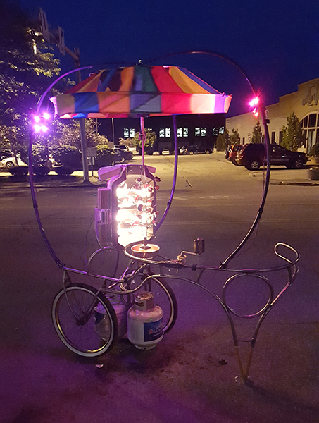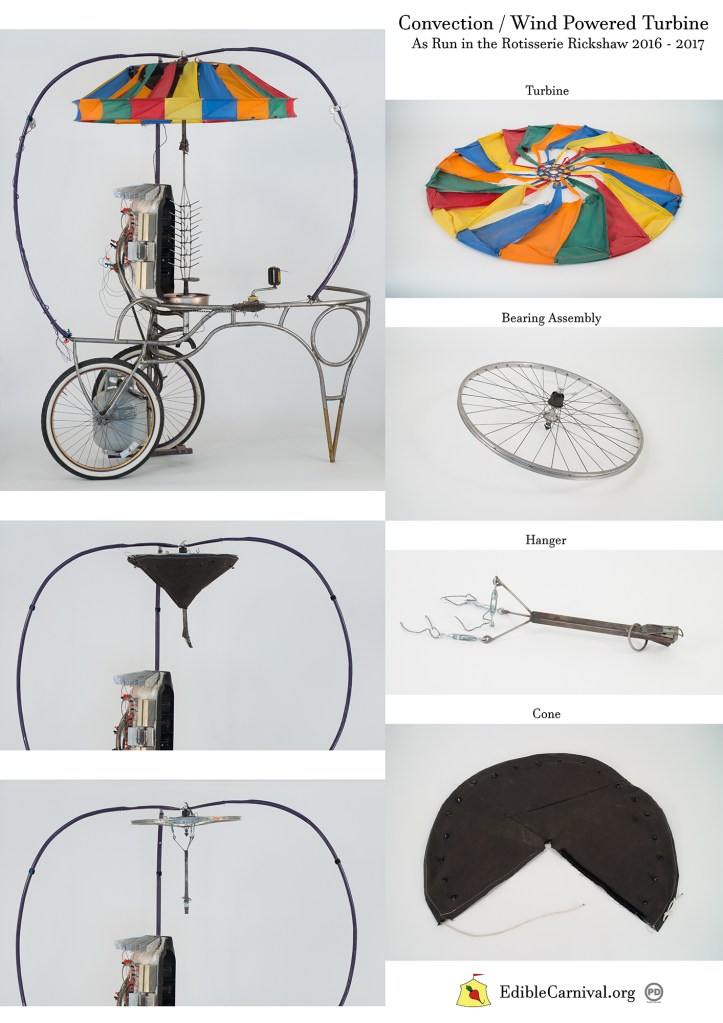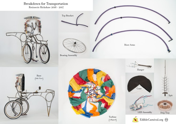 The Rotisserie Rickshaw is a specialized propane grill and sculptural research project. It harnesses the convection of hot air to turn a turbine that drives the spit, slowly rotating vegetables as they roast.