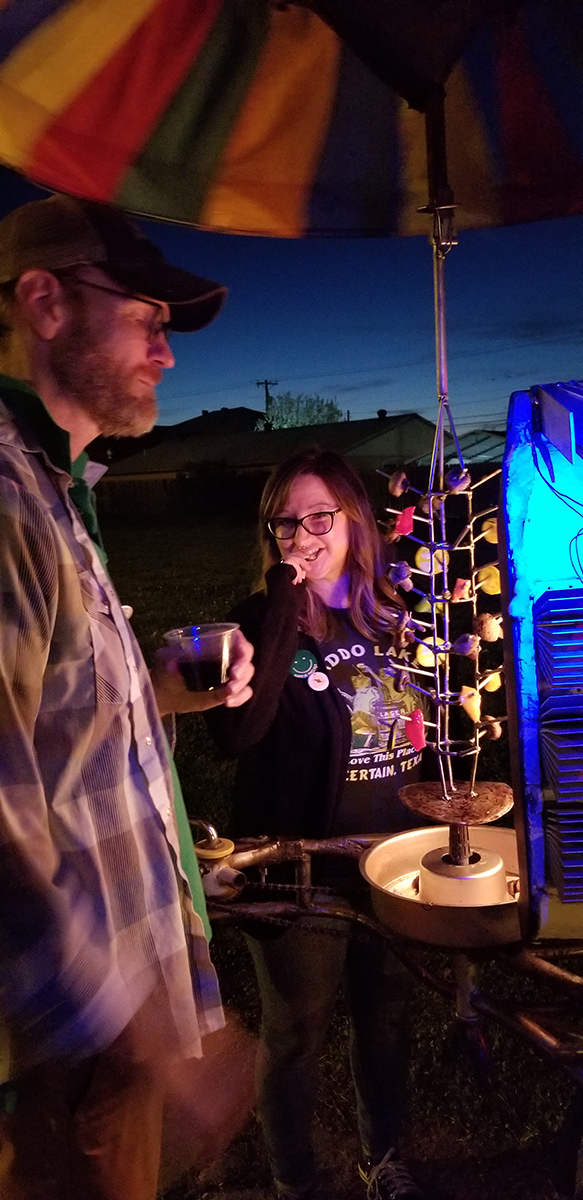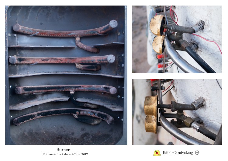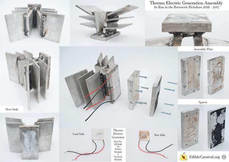 Excess heat is dissipated through an array of Peltier modules (or thermoelectric generators) that provide electrical current to power a series of LEDs that illuminate the work. During events the Rotisserie Rickshaw roasts vegetables that are given freely to the audience while information about the systems and their functionality is shared.